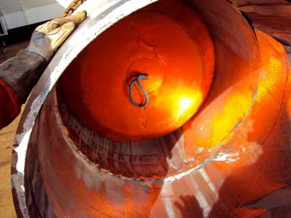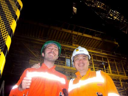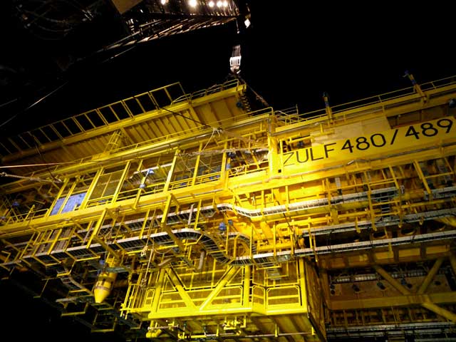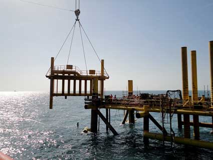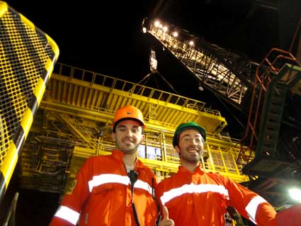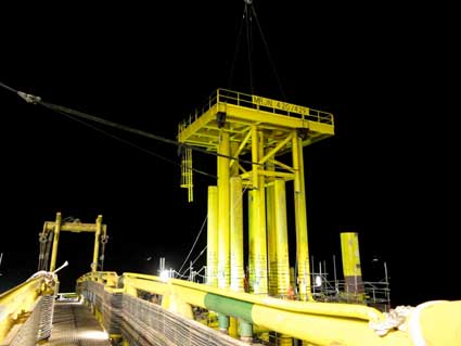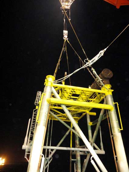 - Lavori di completamento del jacket, es. rimozione dei pad-eye di sollevamento della piattaforma, installazione della scala di accesso alla piattaforma, saldatura di piastre e travi di collegamento tra la piattaforma e la piattaforma esistente di trivellazione.